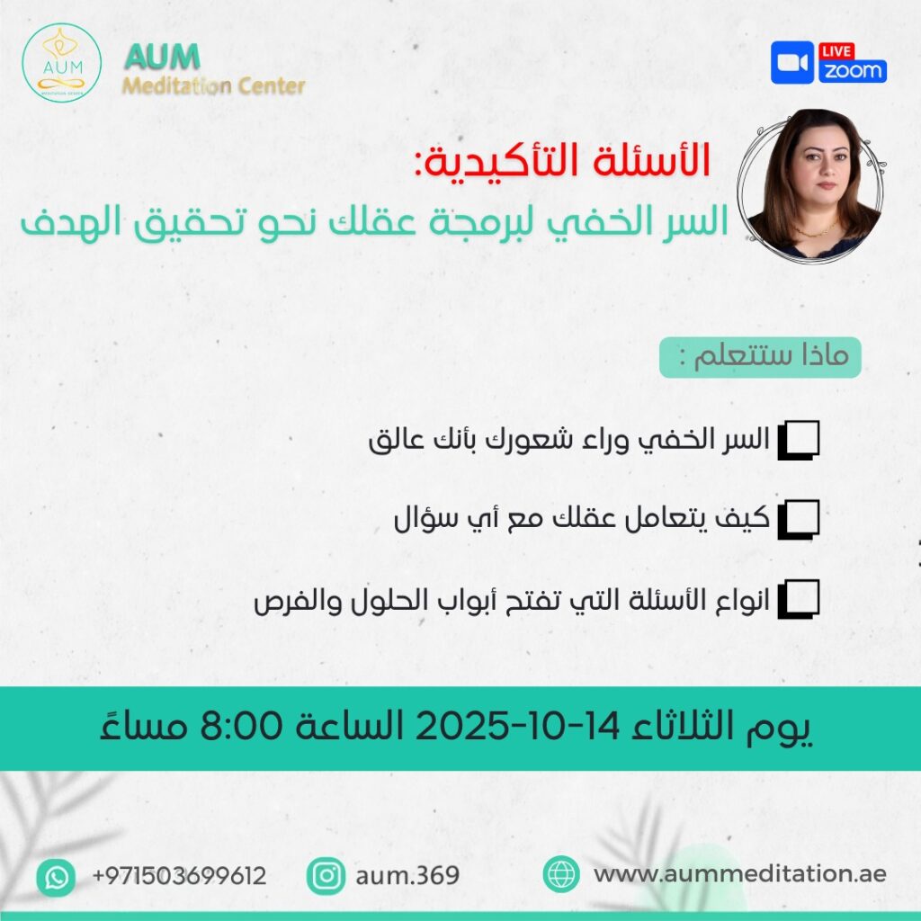 في هذه الجلسة العملية، ستتعلمون تقنية الأسئلة التأكيدية لإعادة برمجة العقل الباطن والتركيز على الحلول بدل العقبات 💫